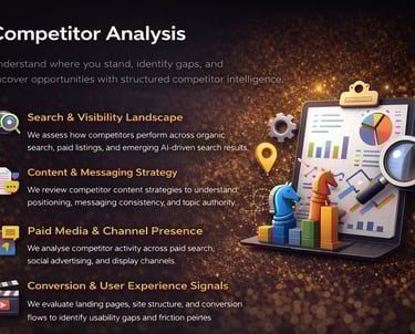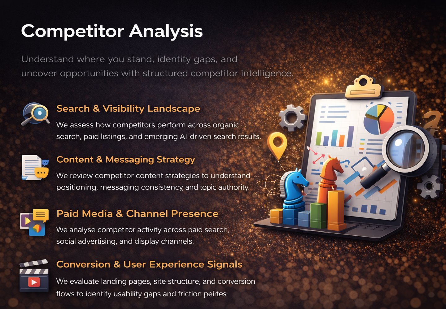 Competitor analysis is the structured evaluation of competitors’ digital presence, performance, and positioning across search, content, paid media, and user experience.